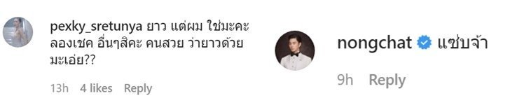 โดยภาพที่ตั๊กแตนได้พูดถึงผมที่ยาวขึ้น เพื่อนศิลปินอย่าง เป็กกี้ ศรีธัญญา (ดรุณี สุทธิพิทักษ์) ก็ได้มาคอมเมนต์ติดตลก ในขณะที่ น้องฉัตร-ฉัตรชัย เพียงอภิชาติ ก็ได้มาแสดงความเห็นสั้นๆ ว่า "แซ่บ"